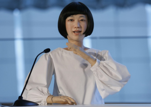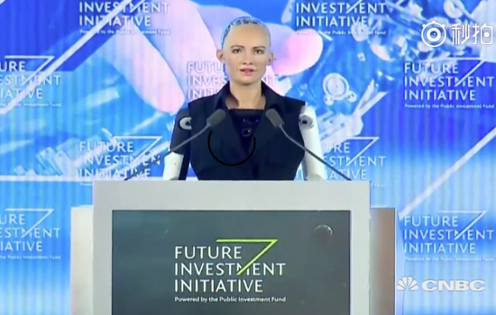 女性机器人“索菲娅”在演讲(美国全国广播公司有线财经频道截图)