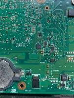 维修过程:拆机发现以前有人修过,电池都是把线一根根焊在主板上面的,懒得管它,把电池的接地线取掉后上电电流1.2掉到1.0,示波器抓内存有读一下的波形,但是还是不显,电流跳变不对,换了内存测试一个鸟样。测了电压都正常,先软的,论坛下载一个BIOS刷上,再次上电电流1.2 1.0 1.5 1.8看电流已经过内存,接屏已经显示了,装机测试都正常,