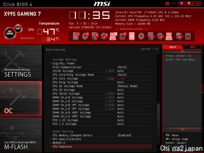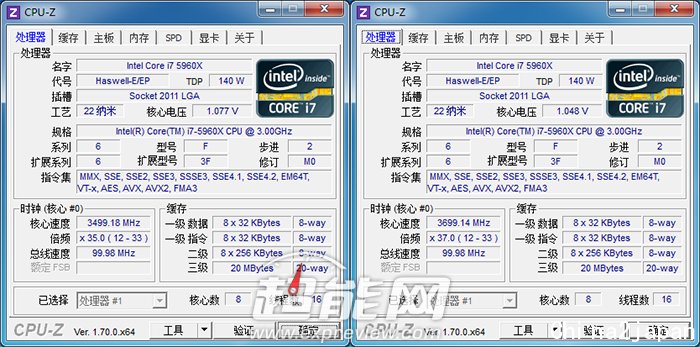 首先我们来看看微星X99S Gaming 7主板在OC Genie一键超频方面的表现。OC Genie超频非常简单,玩家只需在开机前按下主板上的OC Genie按键,那么在开机后主板将自动提升CPU和内存的频率,按照微星表示,OC Genie在理论上至少可以提升20%的系统性能。Core i7-5960X处理器在OC Genie支持下可以自动超频至3.7GHz,只是相比起默认频率提升幅度并不大,毕竟Core i7-5960X在Turbo Boost支援下也能跑到3.5GHz。