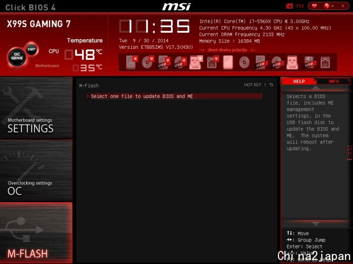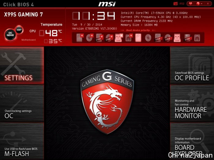 微星X99S Gaming 7主板的BIOS界面Click BIOS的界面采用模块化设置,大体上分为设置、OC、M-Flash、OC配置文件、硬件监控及主板浏览器六部分,上方则为系统信息、 一键超频、XMP及启动选择等快捷功能,同时也具备收藏夹功能,玩家可以把自己常用的功能设置在收藏夹中,方便自己使用。