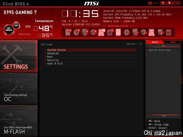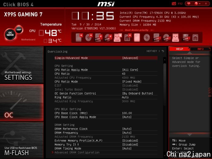 超频测试平台这次的超频测试平台采用微星X99S Gaming 7主板和Core i7-5960X(ES)处理器打造,配套的内存是芝奇Ripjaws 4 DDR4-2666 16GB套装(4GB*4),散热器则是双塔双风扇设计的猫头鹰D15,搭配公版GTX 780 Ti显卡和安耐美白金冰核600W电源。OC Genie一键超频体验
