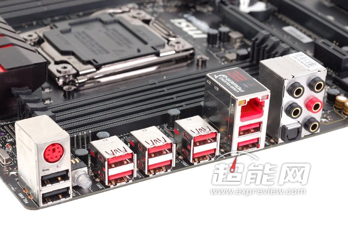 I/O接口主板的7.1声道音频输出接口全部进行了镀金处理,以增强其抗氧化能力,同时也配置有光纤输出接口。此外位于有线网络接口下方的2个USB 3.0接口有做供电强化,供电电流更强、电压更稳定,微星建议玩家把USB音频设备连接在着两个接口上,以确保设备的音频输出质量。除了上述的配置外,微星X99S Gaming 7主板的后置I/O接口基本上是以USB 3.0接口为主,共计有8个USB 3.0接口,为了在整体配色上达到统一风格,这些USB 3.0接口全部改用红色而不是传统的蓝色,另外PS/2接口下方的是两个USB 2.0接口,是用来连接键鼠设备的。不仅是第二代AudioBoost技术,微星X99S Gaming 7主板还配置有Killer E2205网卡,其有线网络接口就是由Killer E2205芯片提供的。Killer E2205芯片支持Stream Detect技术,可自动侦测并加速游戏程序,让在线游戏和实时聊天软件优先使用带宽,尽可能降低网络游戏延迟,提升玩家在联网游戏时的体验。