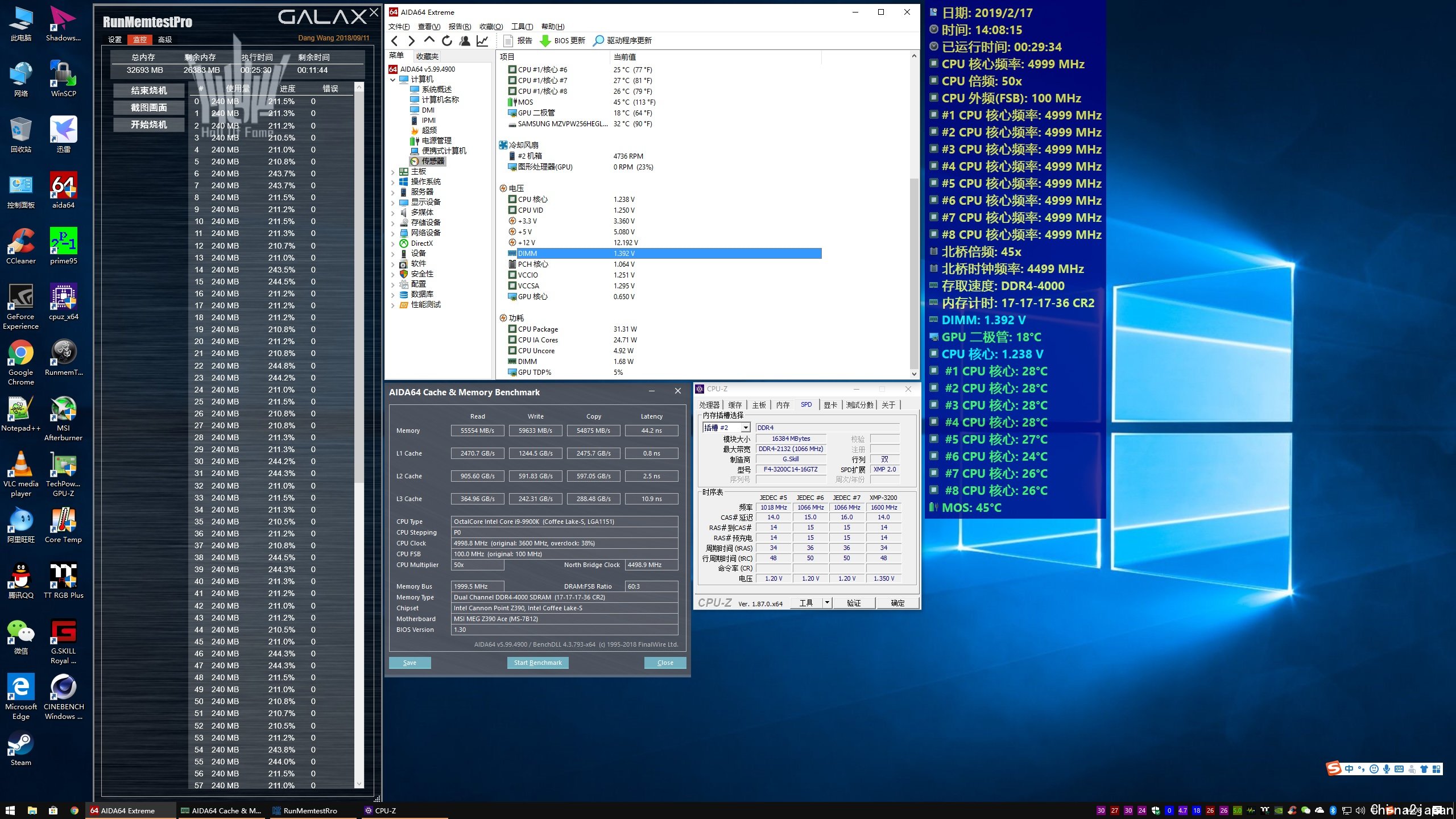 6、最后、买了华硕的Z390I 同样一套,幻光戟 3200 C14 16X2 可以4133 C17点亮,但MT 80%左右就出错,放宽时序或者加压 减压反而无法点亮(无解),4133以上没点亮过,也许华硕这块板超内存的能力确实不怎么样,后来就没试了,但可以证明,上一块主板B1插槽是应该有问题的,虽然超频只是学习性,也不求日常能超多少,但起码东西没问题才用得舒服。